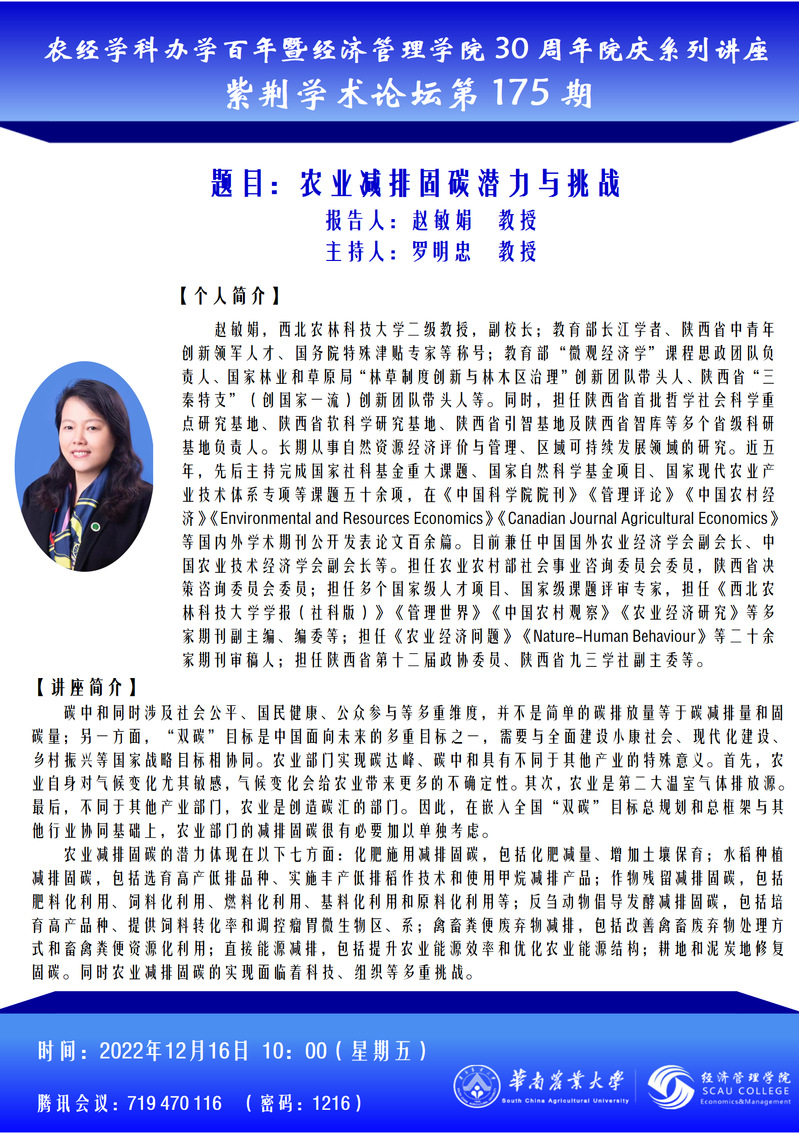 农经学科办学百年暨yl6809永利官网30周年院庆系列讲座:紫荆学术论坛第175期