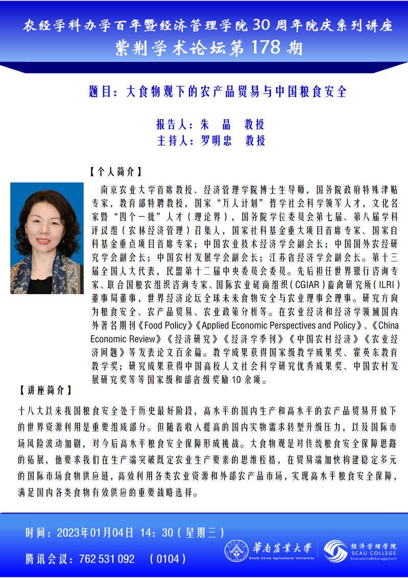 农经学科办学百年暨yl6809永利官网30周年院庆系列讲座:紫荆学术论坛第178期