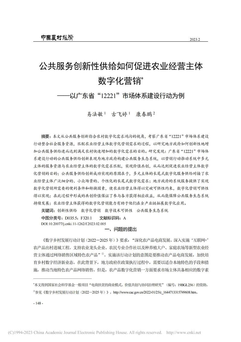 题 目: 公共服务创新性供给如何促进农业经营主体数字化营销——以广东省“12221”市场体系建设行动为例