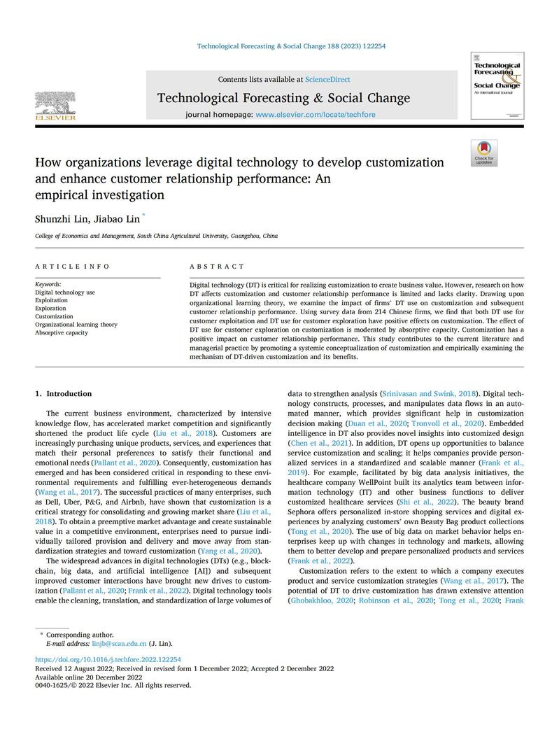 题 目:How organizations leverage digital technology to develop customization and enhance customer relationship performance: An empirical investigation