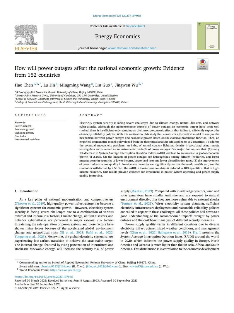 题 目: How will power outages affect the national economic growth: Evidence from 152 countries