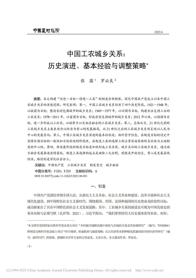 关键词 中国共产党;工农城乡关系;制度变迁;城乡融合