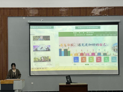 班级宣讲会上,各队伍系统介绍学校发展沿革、综合实力、培养特色、招生政策等信息,同时采用“线上线下”相结合的形式带领同学们“云游”华农,沉浸式感受美丽舒适的校园环境,了解红砖绿瓦下厚重的办学历史。