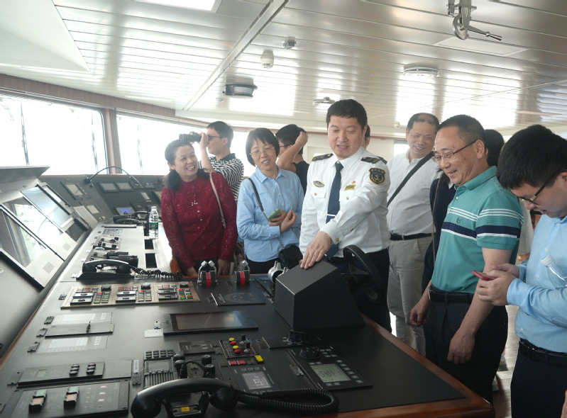 教工党员在海巡09船长的带领下,登船参观了海巡09工作及生活区域,零距离感受“海巡09”的魅力。参观中,船长详细介绍了海巡09设计理念、基本配置、主要性能、先进仪器设备等,讲解该船在保障海上交通安全保护海洋环境维护国家海洋权益和服务地方经济发展等方面发挥的作用,并以视频的形式展示“航海故事”,普及中国海洋、海事文化的发展历史。