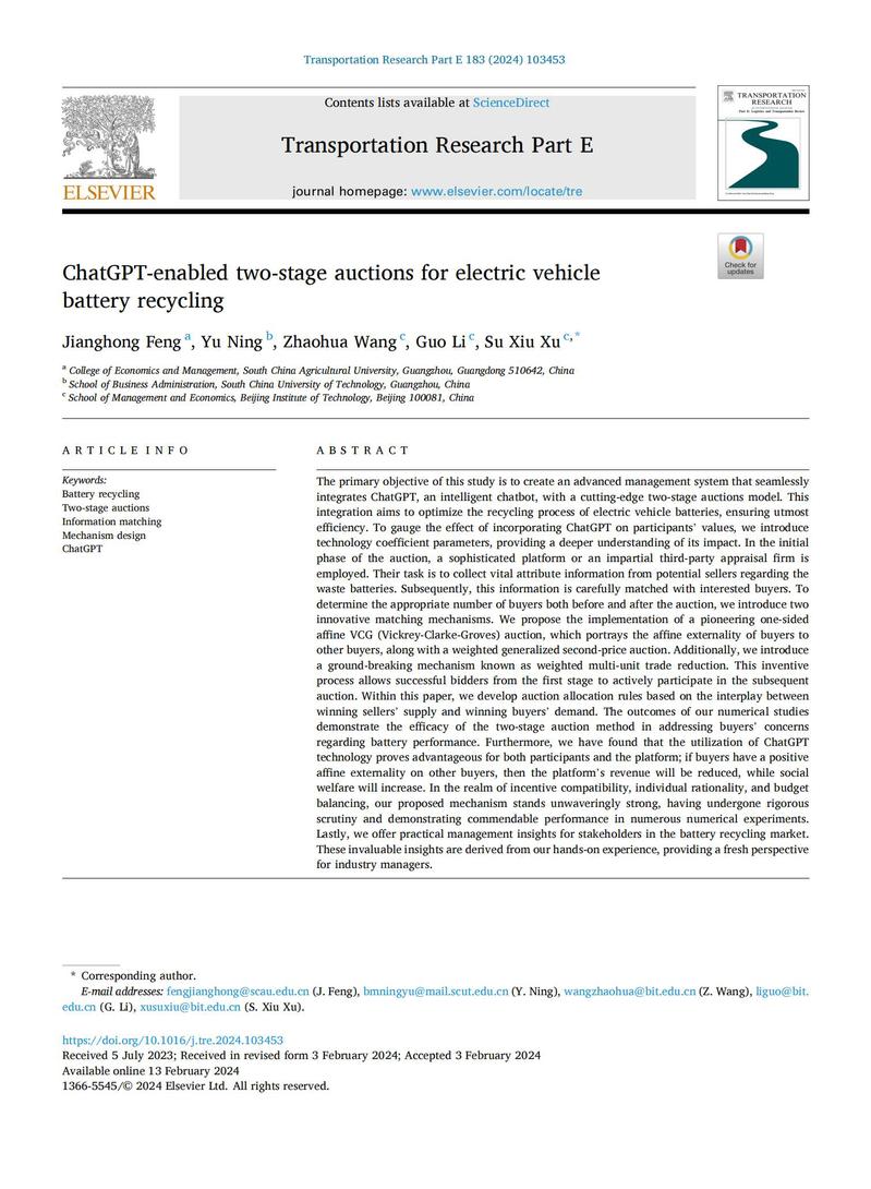 题目:ChatGPT-enabled two-stage auctions for electric vehicle battery recycling