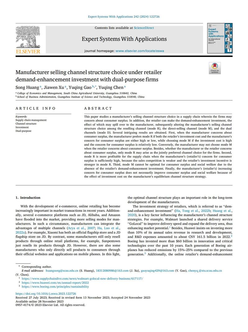 题目:Manufacturer selling channel structure choice under retailer demand-enhancement investment with dual-purpose firms