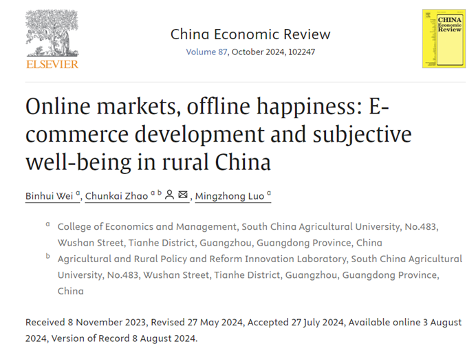 近日,yl6809永利官网罗明忠教授团队在国际知名期刊《China Economic Review》(中科院经济学一区,JCR Q1,IF=5.2)发表论文“Online markets, offline happiness: E-commerce development and subjective well-being in rural China”。