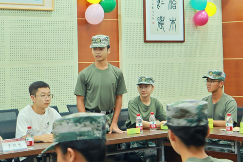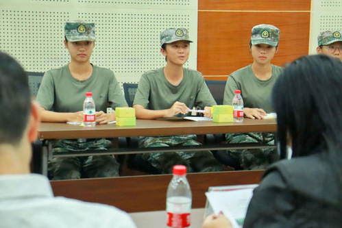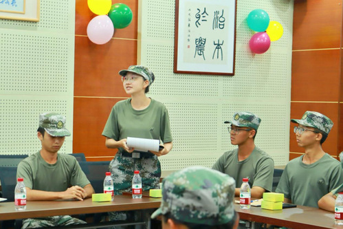 经管中队副中队长刘书文向学院领导作关于军训整体情况、所遇困难的汇报,并提出了对学院军训工作的思考和建议。对此,张晖书记作出重要指示,她明确提出了三个要求:一是树立自我榜样,追求高标准品质;二是严格遵守军人纪律,强化纪律意识;三是注重安全防范,确保劳逸结合。