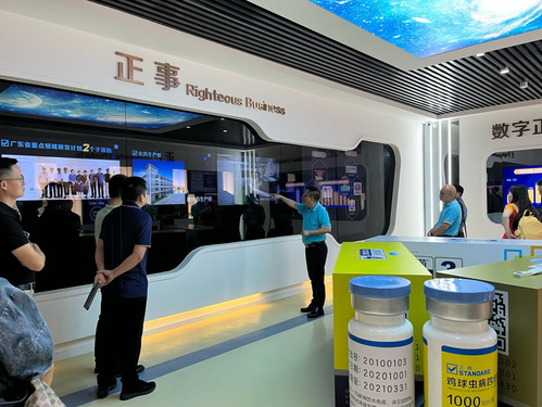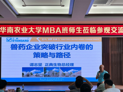 在副总经理符德文的带领与介绍下,华农MBA师生首先参观了正典的厂区及展厅,深入了解了公司的发展历程、核心业务、技术创新和行业成就。正典是全国首家获得动保GMP认证的生物技术企业,专注于畜牧防疫及肠道健康产品的研发和生产,秉持“正人、正事、正品”的核心理念,赢得了业内外的高度评价。正典公司中有相当一部分员工也来自yl6809永利官网,这种深厚的校企渊源为双方合作奠定了坚实的基础。