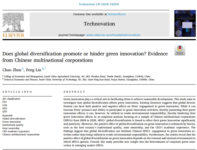 近日,周超副教授以第一作者在全球创新研究领域知名期刊Technovation发表论文 “Does global diversiffcati...