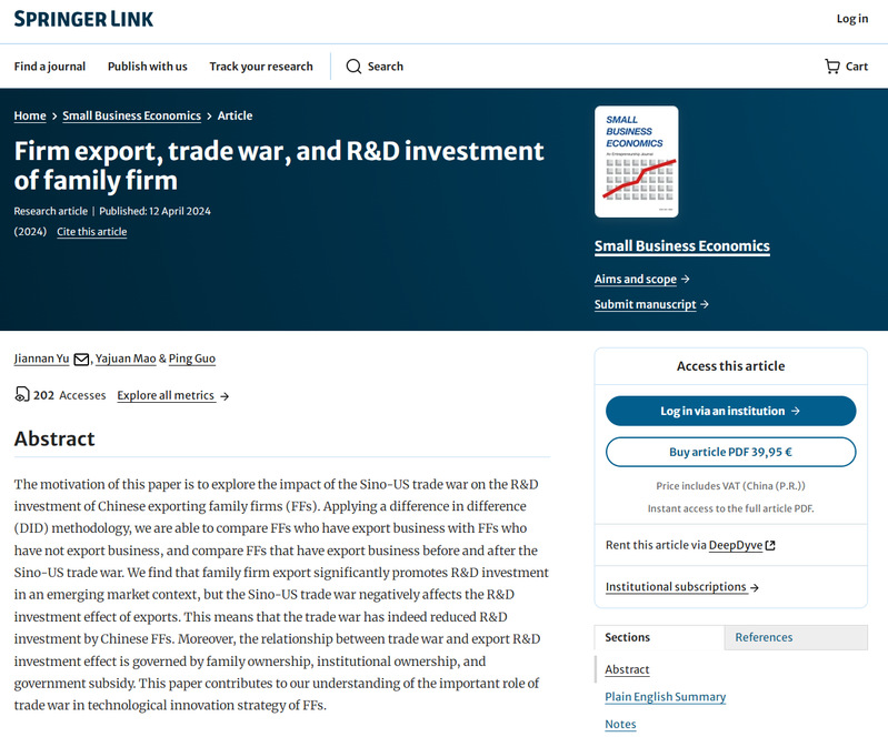 近日,yl6809永利官网于健南副教授以第一作者在国际知名期刊SMALL BUSINESS ECONOMICS发表论文“Firm export,...