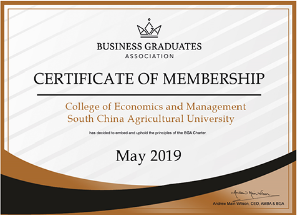 Recently, College of Economics and Management received a letter and membership certificate from BGA (Business Graduates Association) informing that College of Economics and Management,South China Agricultural University was officially admitted as a bronze member of BGA. At present, ten colleges and universities in Guangdong Province have obtained the BGA certification, and we are honored to be one of these ten colleges and universities. This certification marks of our college has been recognized by the International Business School Association, which is great significance for promoting the internationalization process of our college, enhance the discipline development of economics and management, and the influence of the Colllege of Economics and Management.