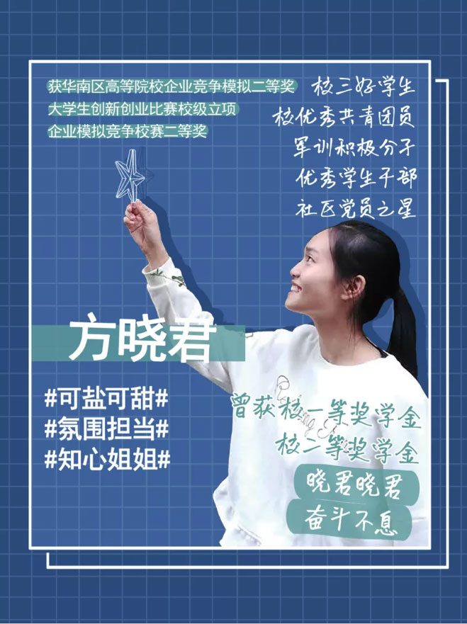 提及方晓君的名字,大家的反应都是:“晓君是一个特别帅的女孩子。”大一时,她加入教官团,每早六点起床参加训练,七点吃完早饭便准备上课……在最忙的时候,她还报名担任心晴使者,兼任楼层代表。
