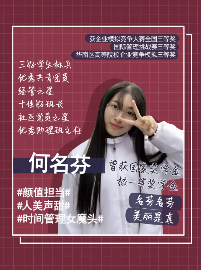 除了成绩优异,她还是一个优秀的学生干部。同时担任班长、专业负责人、18级经济2班心使…… 丰富的学生干部经历造就了何名芬的雷厉风行。“我做事比较果断,会提前去踩ddl”,她笑着说,“她们都叫我女魔头。”