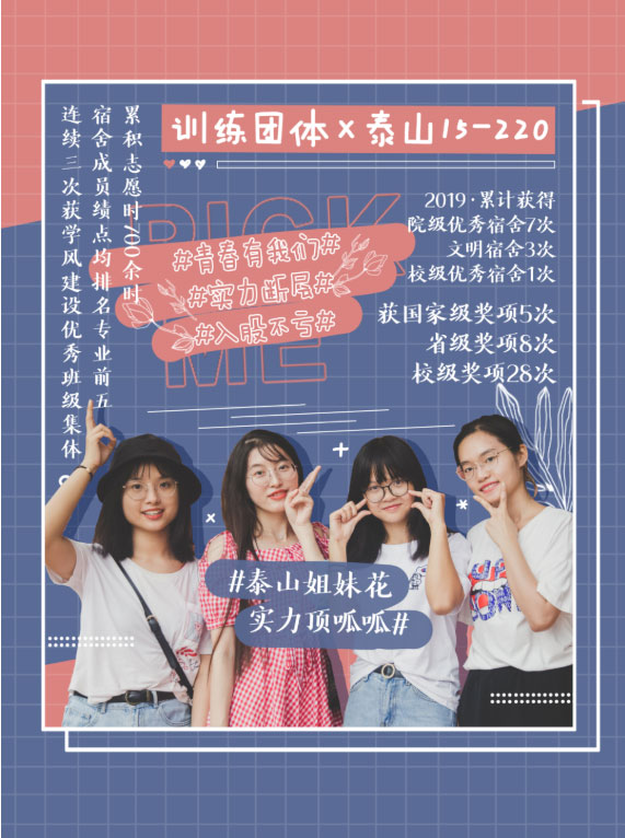 彼时受到助班心使的影响,优秀的榜样明晃晃地在前头,四位女孩暗暗下定决心:这四年定要好好过。关于这个“好”字如何理解呢?总归是让自己不是在行动,就是在行动的路上吧。关于这一点,四位女孩不谋而合,迅速达成了“资源共享战略”,大大小小的比赛、评选、活动信息总是叮叮叮地闪烁在微信群。